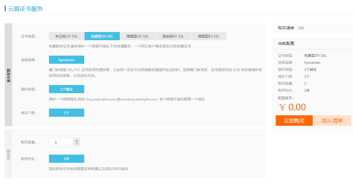 由于近期测试微信小程序,调用wx.request请求网络数据时需要后台接口采用https,因此寻找了一些SSL证书签发机构,综合成本和操作便捷性来说,目前我个人采用了与阿里云合作的Symantec证书产品, 免费期限为1年.