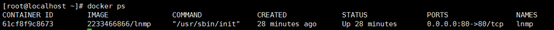 a) docker run -dit -p 80:80 -v /home/www:/www --privileged=true --name=lnmp 2233466866/lnmp - 查看运行容器(见图一)