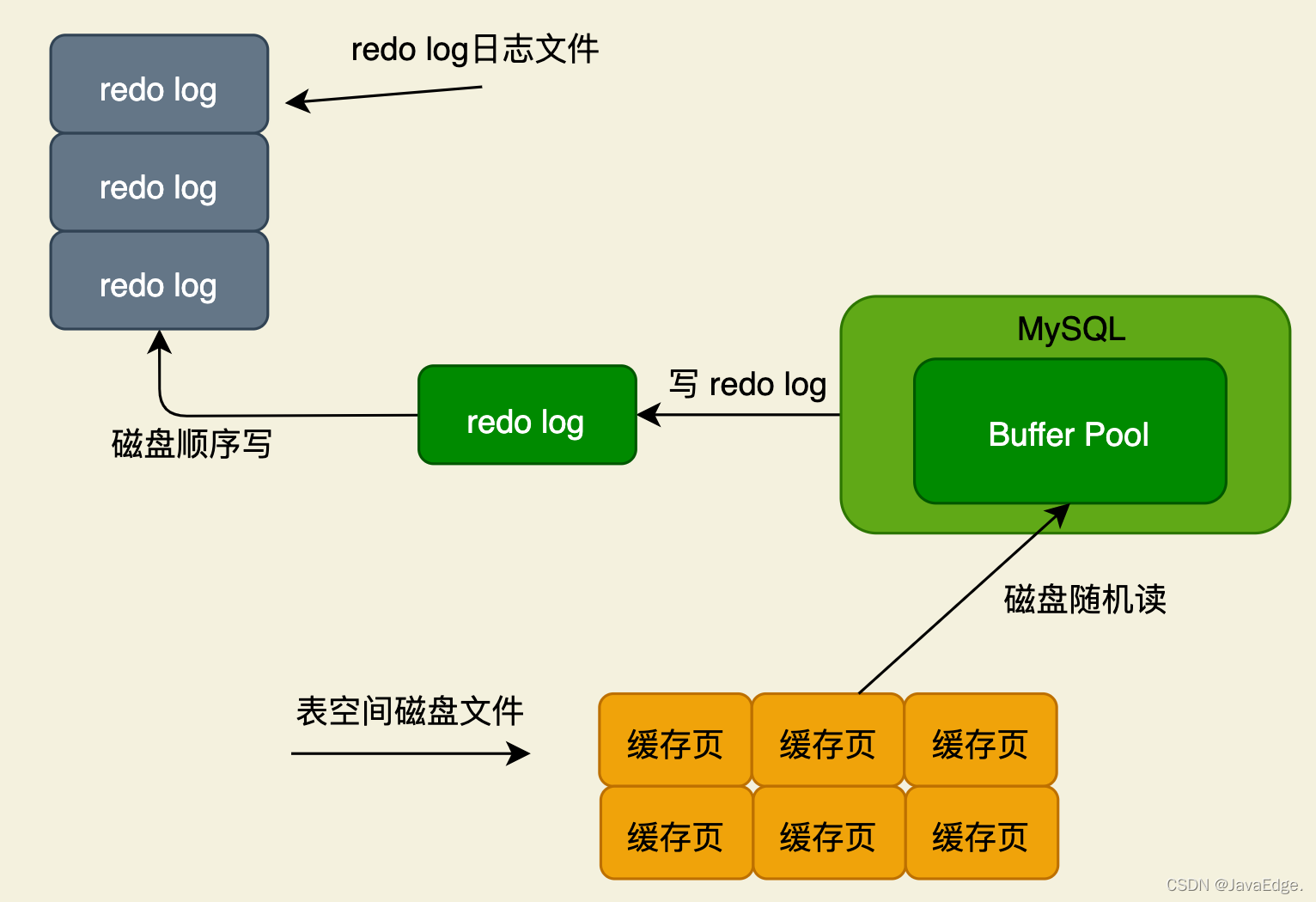 当你在BP的缓存页里更新数据后,必须要写条redo log日志,它就是顺序写:在一个磁盘日志文件里,一直在末尾追加日志