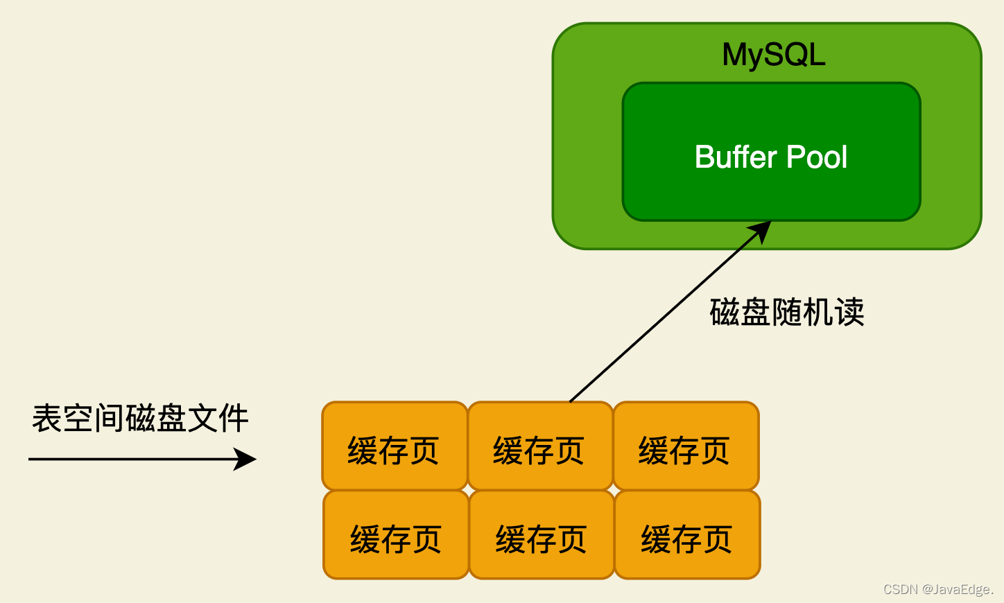 如下图有个磁盘文件,里面有很多数据页,可能需要在一个随机位置读取一个数据页到缓存,这就是磁盘随机读