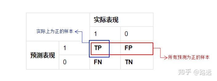 精准率(Precision)又叫查准率,它是针对预测结果而言的,它的含义是在所有被预测为正的样本中实际为正的样本的概率,意思就是在预测为正样本的结果中,我们有多少把握可以预测正确,其公式如下: