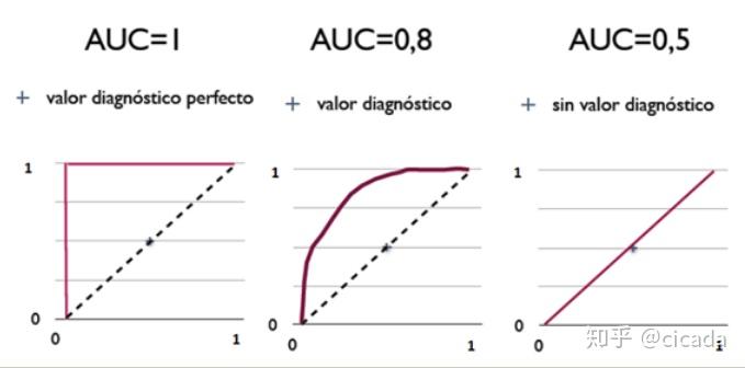 1,是完美分类器,采用这个预测模型时,存在至少一个阈值能得出完美预测。绝大多数预测的场合,不存在完美分类器。 - 0.5 < AUC <