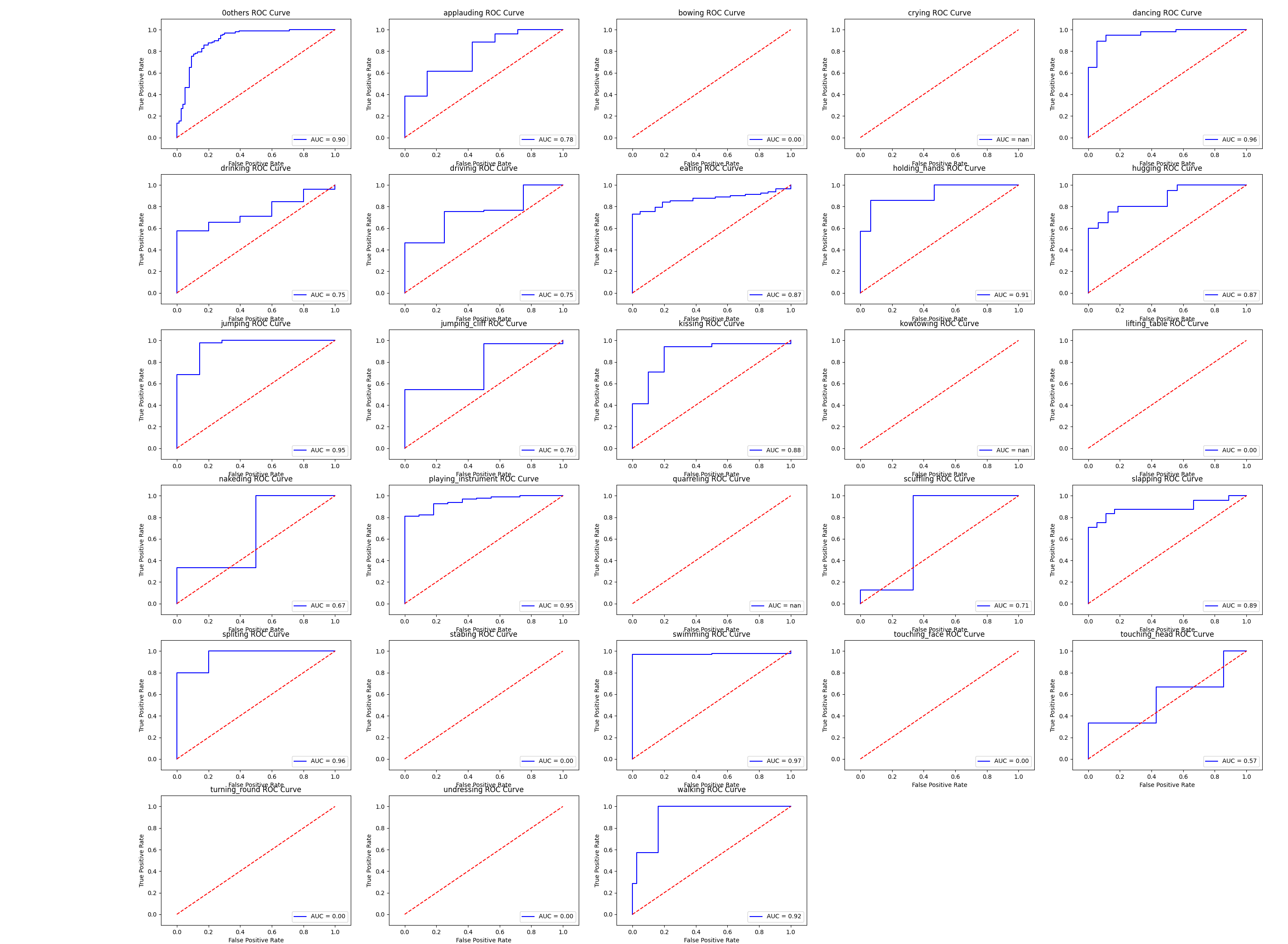 def show_roc_info(classdict, show=True, save=False, figsize=(30, 22), fontsize=12): """ 多类别情况下计算展示每个类别的roc-auc图 :param classdict: :param show: :param save: :param figsize: :param fontsize: :return: """ def sub_curve(fpr, tpr, auc_score, class_name, sub_idx): plt.subplot(6, 5, sub_idx) plt.title(\'%s ROC Curve\' % class_name) plt.xlabel(\'False Positive Rate\') # 横坐标是fpr plt.ylabel(\'True Positive Rate\') # 纵坐标是tpr plt.plot(fpr, tpr, \'b\', label=\'AUC = %0.2f\' % auc_score) plt.legend(loc=\'lower right\') plt.plot([0, 1], [0, 1], \'r--\') plt.xlim([-0.1, 1.1]) plt.ylim([-0.1, 1.1]) if show: plt.figure("Maoyan video class AUC Curve", figsize=figsize) plt.subplots_adjust(bottom=0.02, right=0.98, top=0.98) for idx, cls in enumerate(MY_CLASSES): if cls in classdict: fpr, tpr, thresholds = calc_roc_curve(classdict[cls], class_name=cls, show=False) auc_score = calc_auc_score(fpr, tpr) print("%s auc:\t\t\t%.4f" % (cls, auc_score)) if show: sub_curve(fpr, tpr, auc_score, cls, idx + 1) else: print("%s auc:\t\t\t0" % cls) sub_curve([0], [0], 0, cls, idx + 1) if save: plt.savefig("./maoyan_all_auc_curve.png") if show: plt.show()