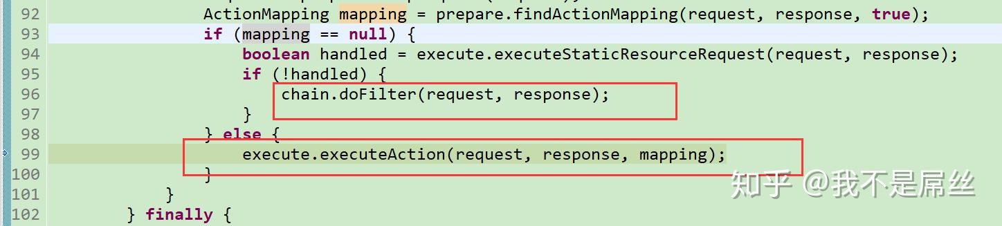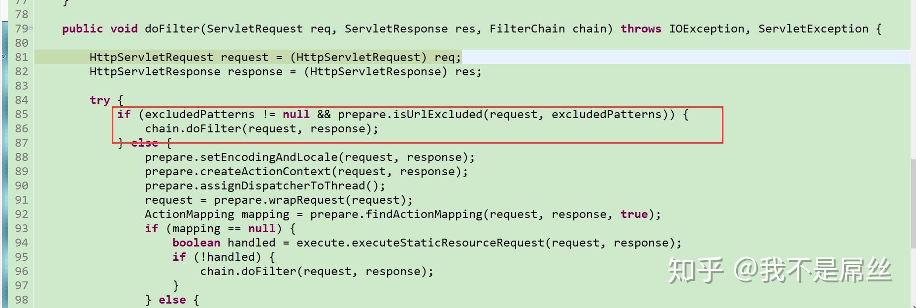 这里的代码就是判断该请求是否归struts2来处理,不归struts2管的话就直接doFilter放行,显然我们这里是需要struts2来处理的请求,所以进行下一步。