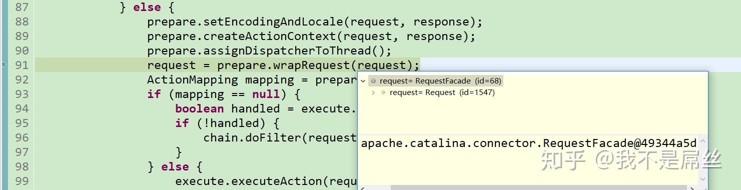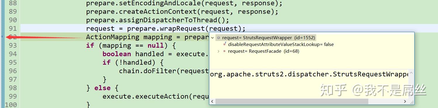 走到核心过滤器这里,我们看到了一个wrapRequest方法,就是包装request对象,学过struts2的就知道,在action中获得到的request就是被包装过的,可以看到没有执行这个方法之前这个request属于org.apache.catalina.connector这个包下。执行这个方法之后呢,竟然变成了org.apache.struts2.dispatcher.StrutsRequestWrapper类,那我们进入这个类中看到底包装了什么呢?