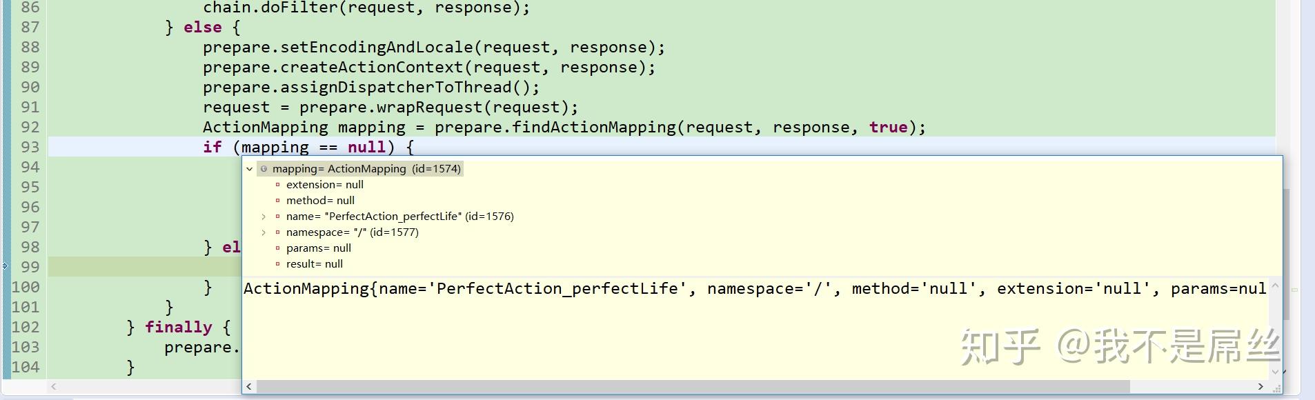 对应上面所说的会调用ActionMapper处理请求如果需要struts2处理这个请求就会返回一个mapping对象,不会就会放行,这里很明显mapping中封装了actionName和namespace等信息。