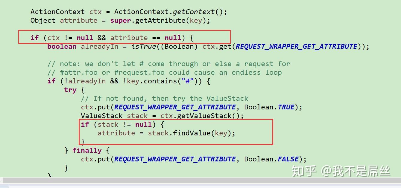意思是如果ActionContext不为空且从原生request中获取到的值为null,我们就去值栈中获取值,调用findValue方法。再根据我们之前学的ognl表达式中,是不是通过一个类的属性就能去值栈中的栈中找到对应的值。由此我们可以推断出在request中取值,首先会在原生request