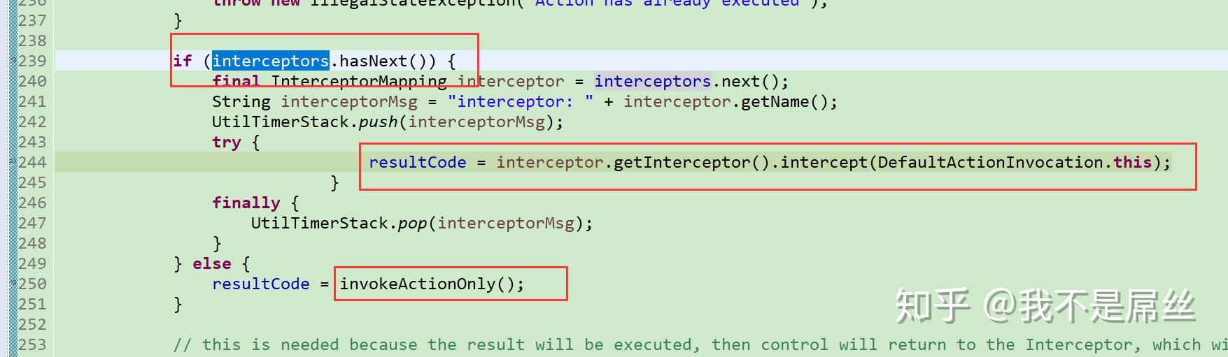 判断这个是否还有拦截器,这里不用while循环而用了if,是因为把秘书对象传给拦截器中的intercept方法,方法中又递归调用了秘书的invoke方法,所以直到调用完拦截器才会执行Action。
