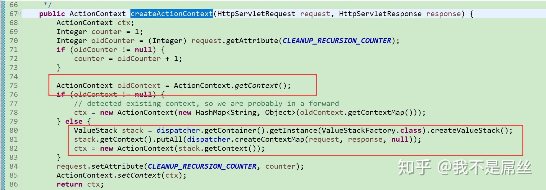 这里我检几个重要的代码给大家看下,第一个圈出来的就是获取数据中心,第二个判断如果之前没有数据中心,我们就创建一个值栈ValueStack,学过struts2的就知道值栈中有个栈,还有个context(Map),接下来看它执行了什么呢,根据request,response创建一个contextMap,put给值栈中的Context,然后再把ValueStack中的Context的获取出来实例化ActionContext,也就是数据中心并返回。下面我们再回来继续走我们的核心过滤器