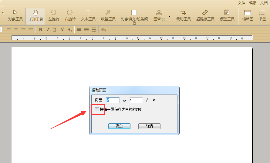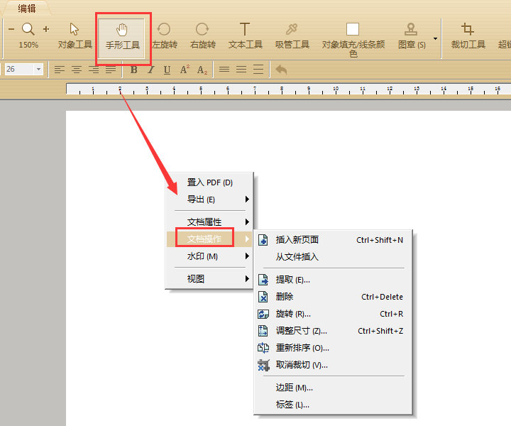 或者先点击上方的“手形工具”后,在PDF任意一页的页面处右击鼠标选择“文档操作”中的提取页面也是可以的。