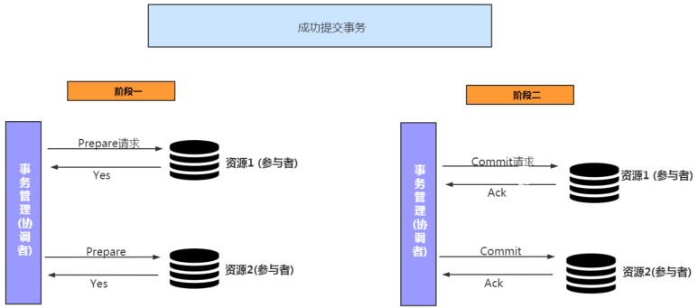 2. 提交阶段(commit phase):如果事务管理器收到了参与者的执行失败或者超时消息时,直接给每个参与者发送回滚(Rollback)消息;否则,发送提交(Commit)消息;参与者根据事务管理器的指令执行提交或者回滚操作,并释放事务处理过程中使用的锁资源。注意:必须在最后阶段释放锁资源。