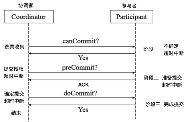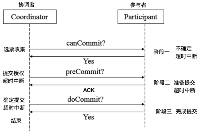 3PC,全称 “three phase commit”,是 2PC 的改进版,将 2PC 的 “提交事务请求” 过程一分为二,共形成了由CanCommit、PreCommit和doCommit三个阶段组成的事务处理协议。
