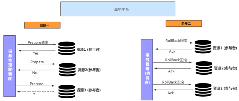2. 事务回滚: 参与者接收到 Rollback 请求后,会利用其在阶段一中记录的 Undo 信息来执行事务回滚操作,并在完成回滚之后释放在整个事务执行期间占用的资源。
