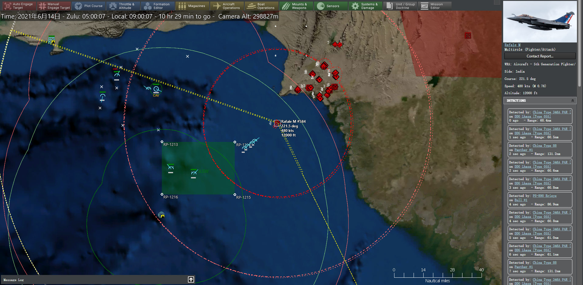 2、印度空军部署的8架阵风-M所携带的16枚AM.39“飞鱼”反舰导弹将会给我方海上打击群带来威胁(尽管055型驱逐舰的拦截能力完全可以应对),但为降低风险,最小化损失,需要在打击群与海岸线之间建立一个空战巡逻任务,并在后方建立空中预警任务,以及早预警和有效拦截。同时,该空域将建立一个电子压制任务区。