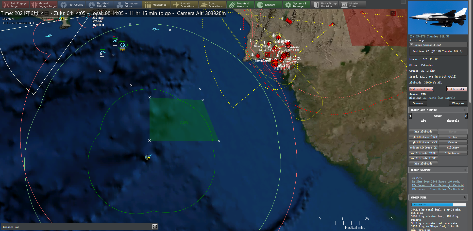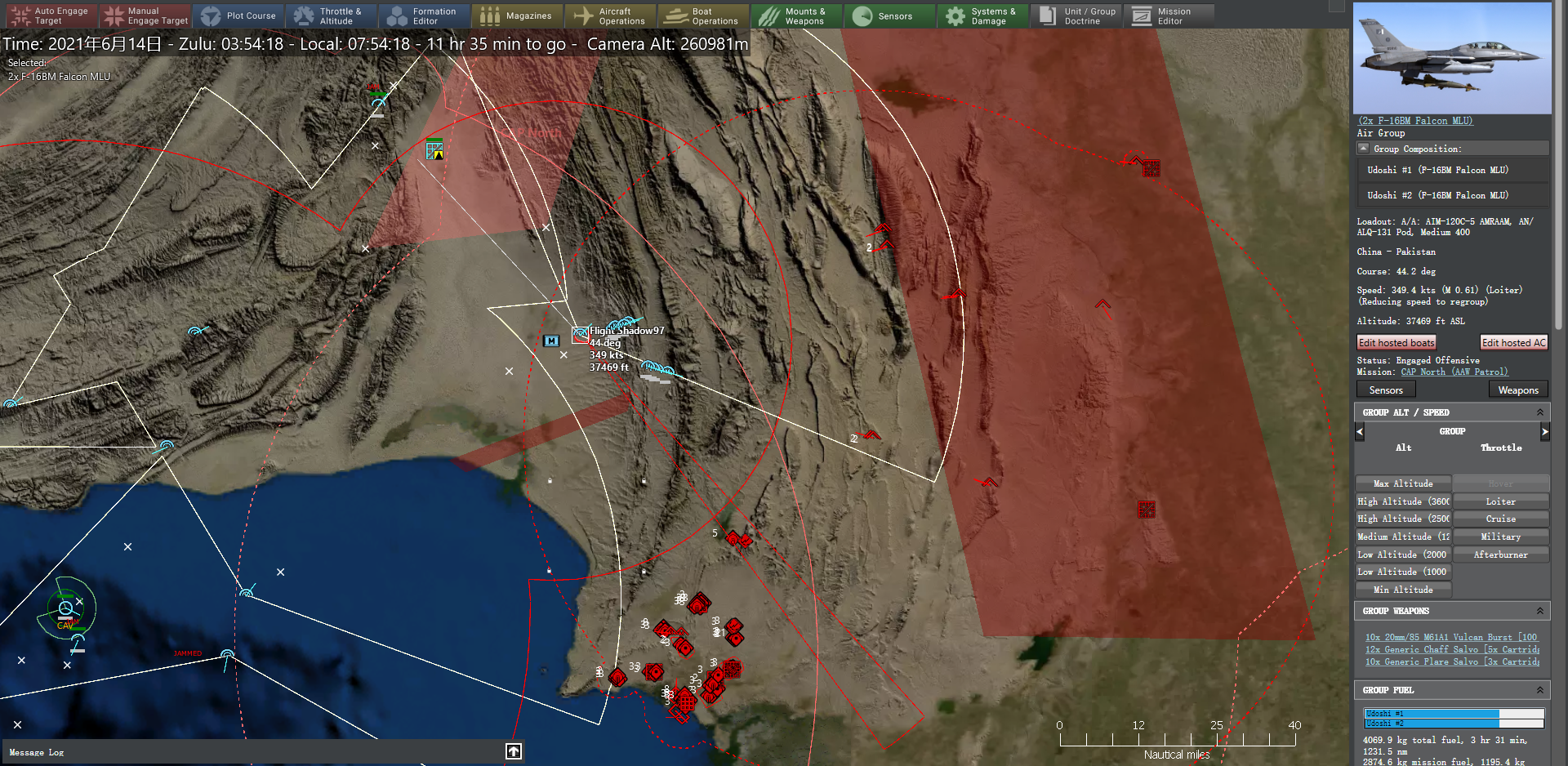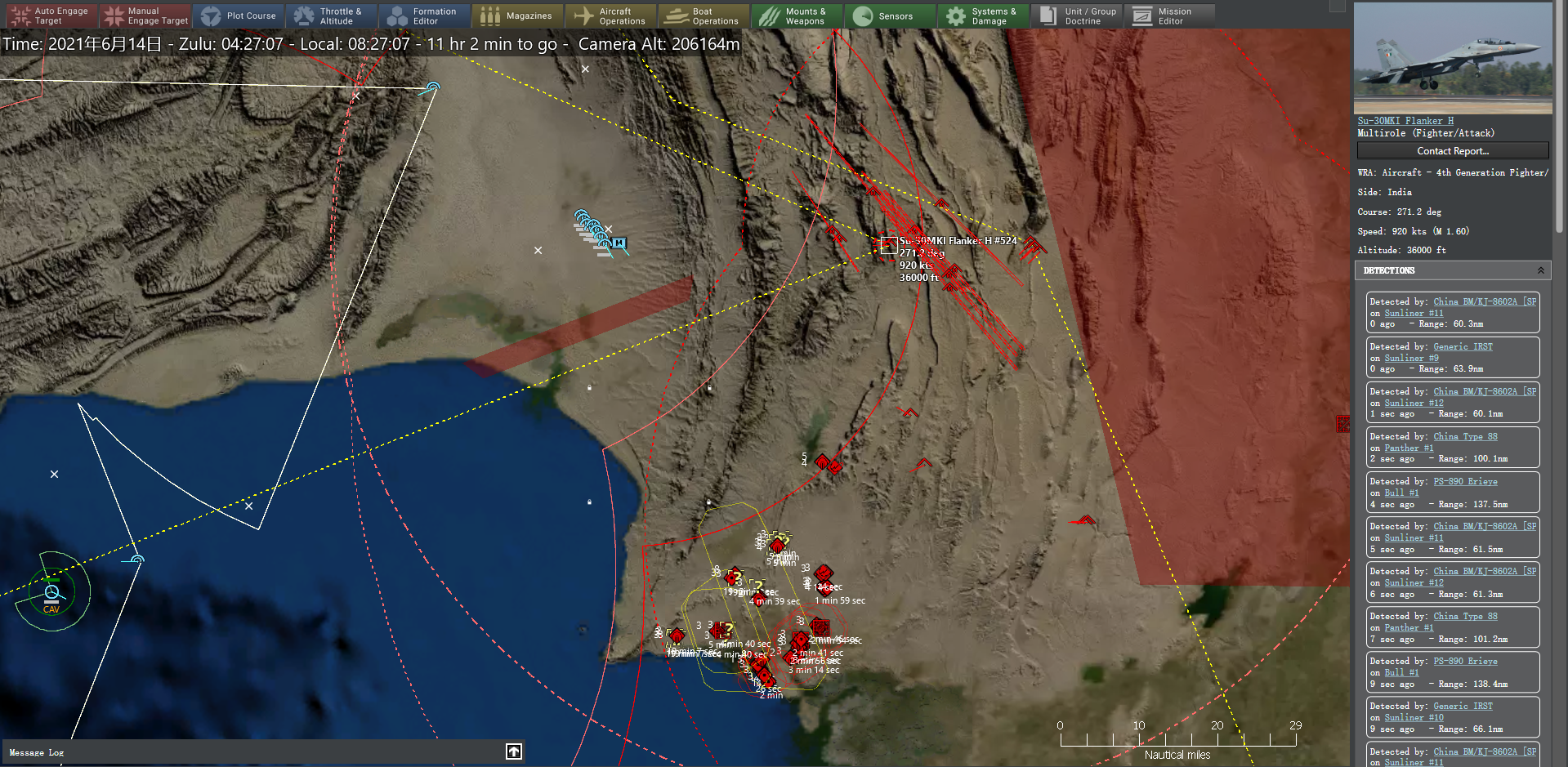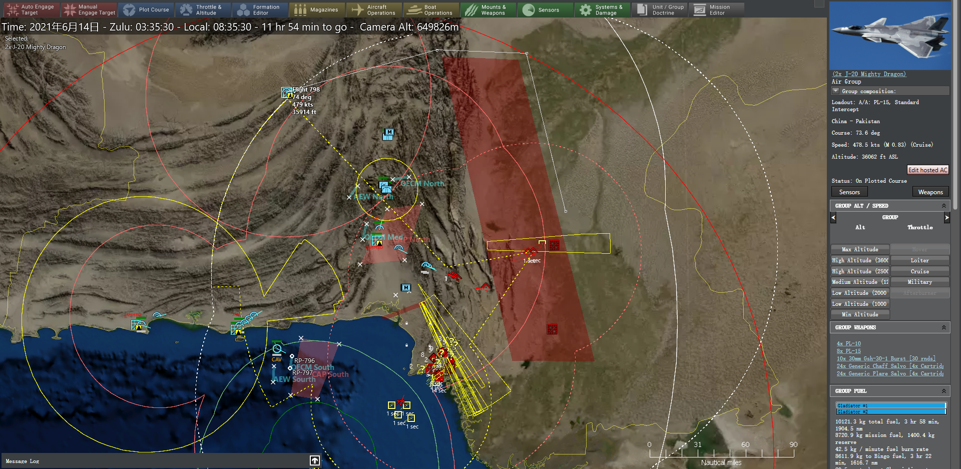 3:35,12枚东风-16命中印度陆军西南战区前线指挥部、S-300PM-1、爱国者2型防空系统。北部空域的防空威胁已经极大减轻,北部空战巡逻任务区得以进一步南移。歼20编队从沙姆西机场升空,意图迂回至敌后方意图击落印方预警机、反潜机等高价值目标(HVU)。卡拉奇以北空域爆发空战,印方6架苏-30MKI以3个长僚编队来袭,位于贝拉机场的我方歼-10C编队立即升空迎战,3个JF-17B(枭龙)编队随后升空支援,在北部和中部电子压制任务的支援下,我方战机以零战损击落来犯的6架苏-30MKI,而歼-10C挂载的霹雳-15型空空导弹成为远距离杀伤苏-30MKI的主要力量。