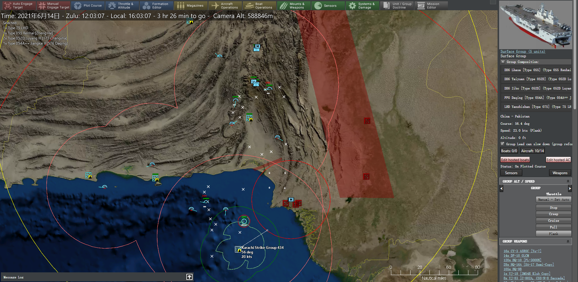 印度洋上制空与制海权已经基本取得,横亘在卡拉奇打击群和卡拉奇港口之间的潜艇威胁成为要解决的优先要务。在卡拉奇打击群的航向上建立反潜任务区,打击群的6架舰载反潜直升机编入反潜任务,同时,为了保护反潜任务区的空域安全,南部空战巡逻区进一步东移,各型支援任务同步向东调整。