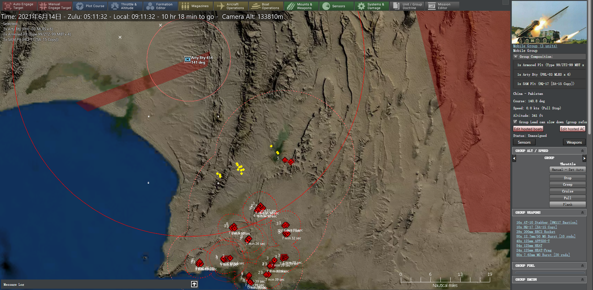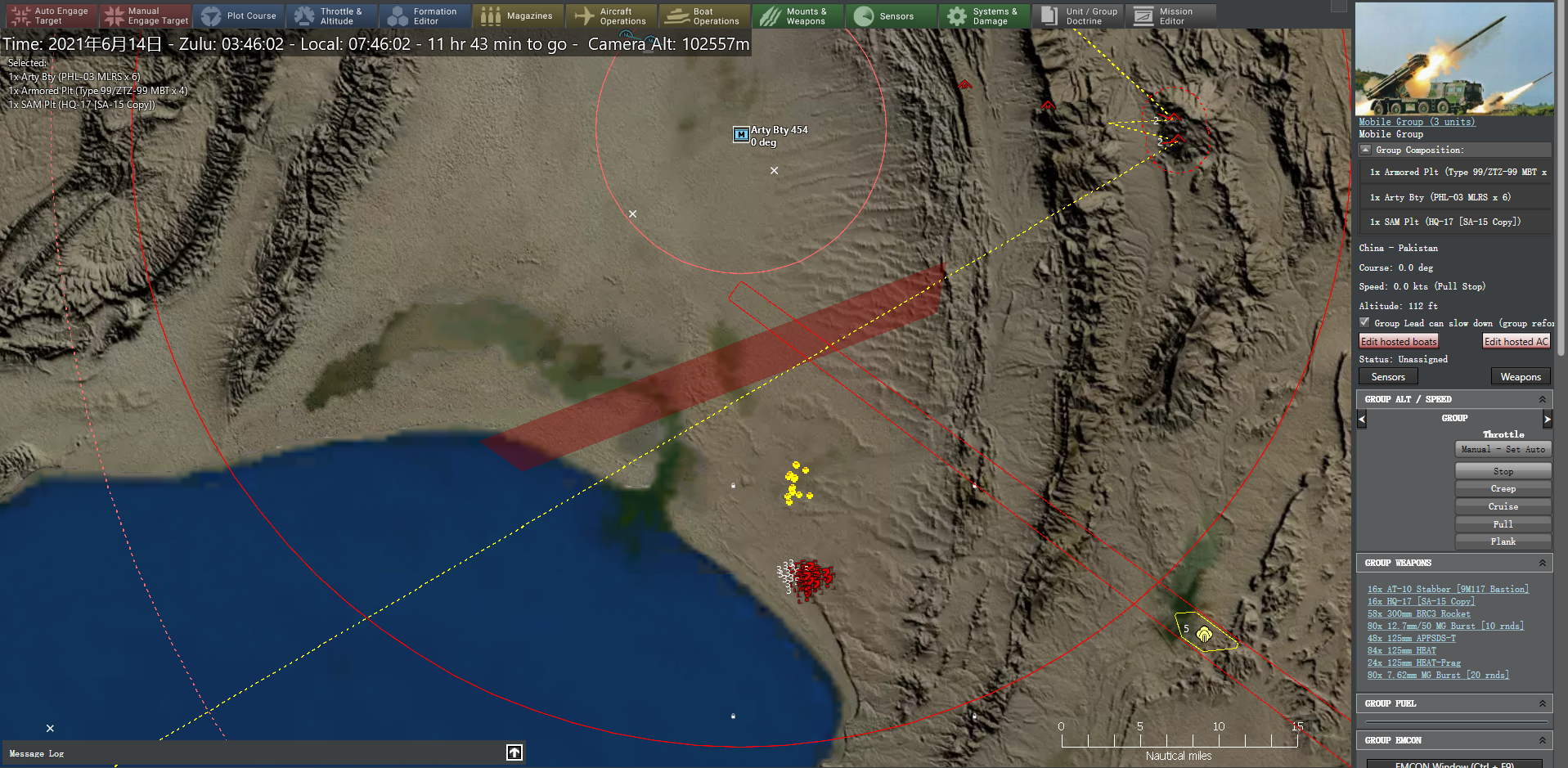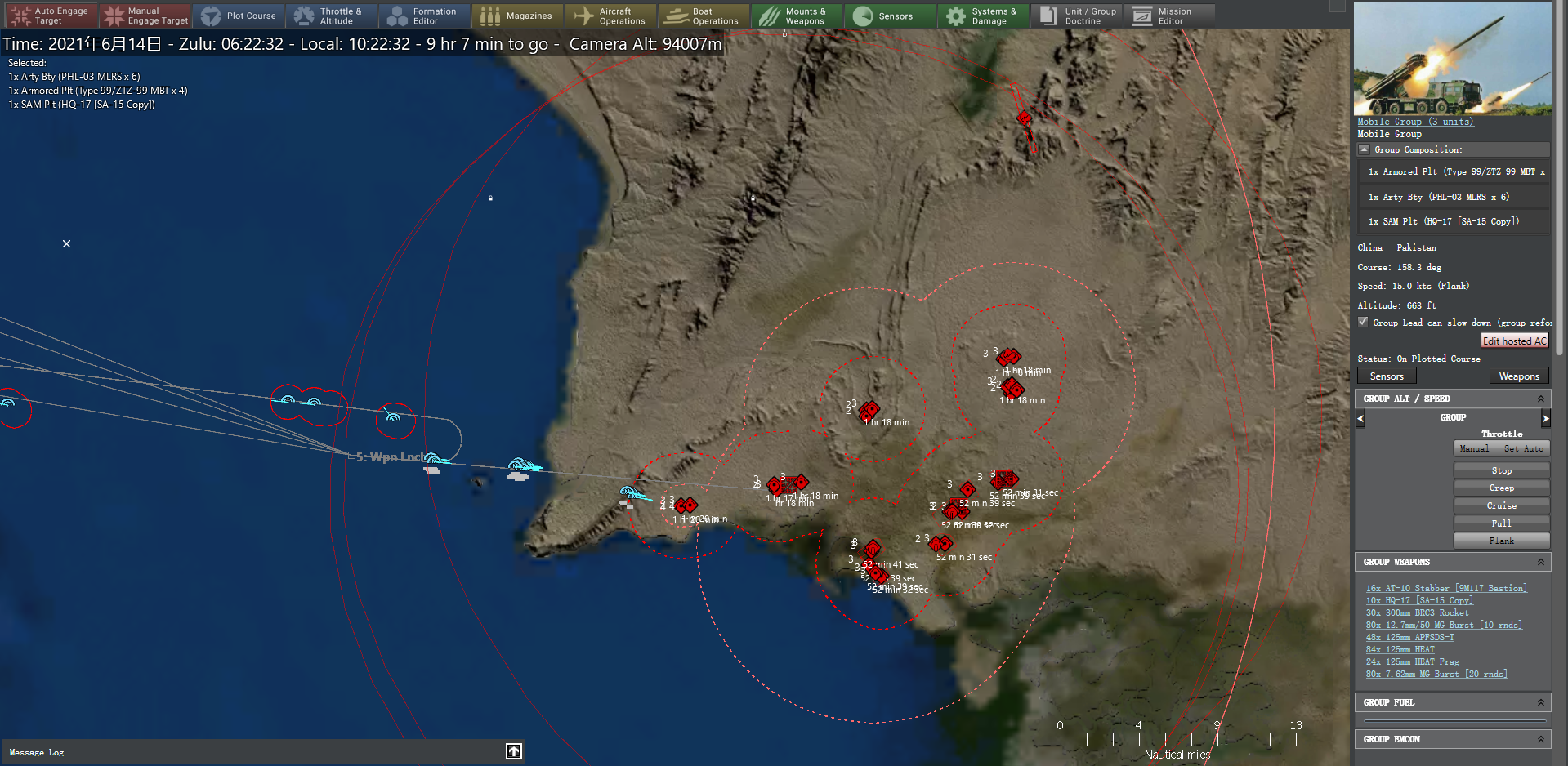 3:45,从伯斯尼机场升空的歼-16机群通过有源相控阵雷达在卡拉奇以西的对峙区发现印军集结点。就在卡拉奇打击群向印方护卫舰编队发起打击的同时,部署在印巴前线的我03式300毫米远程多管火箭炮向印度陆军迅速发起打击,每个地面目标发射一枚,第一轮打击后剩余4个目标,补射4枚后完成打击。最终打击成果为摧毁印方18辆T-72坦克,9辆T-90S坦克,6辆K9自行榴弹炮、6辆40毫米Bofors高射炮等地面部队。肃清印军集结区域后,03式远程火箭炮进一步向南部转移。