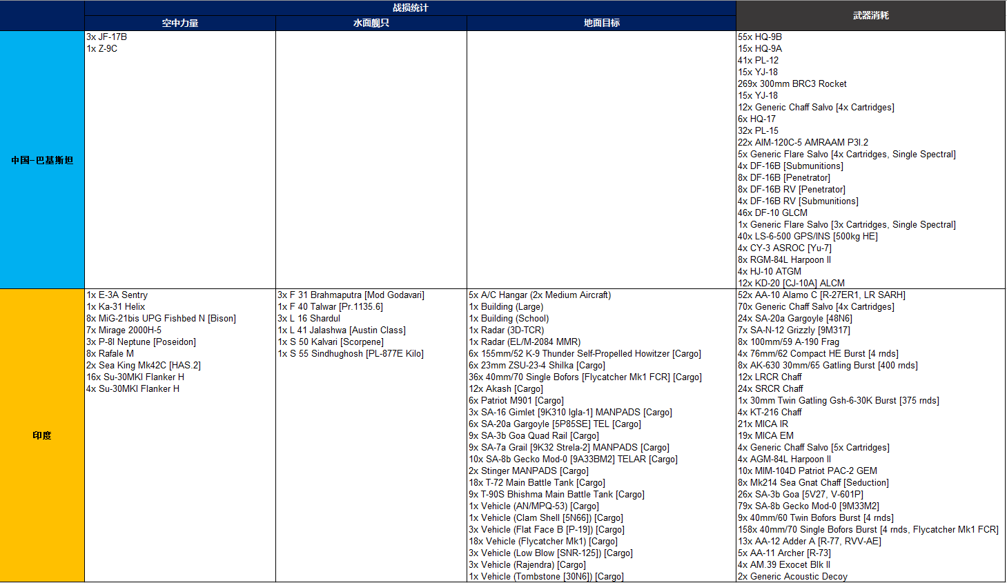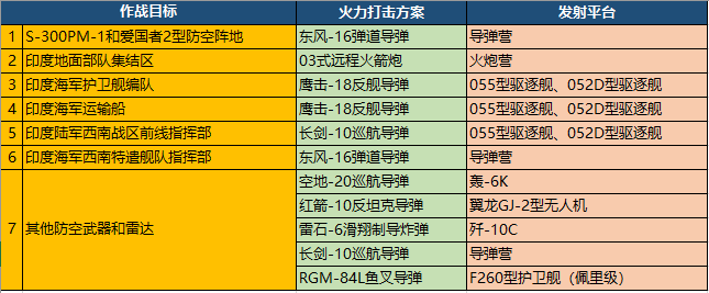 总体而言,想定中的每一个作战目标都有其清晰可靠的火力打击方式,例如针对卡拉奇市郊部署的S-300PM-1和爱国者2型防空阵地,可以通过东风-16进行有效打击,而印度地面部队集结区,则完全可以通过我方03式远程火箭炮进行火力覆盖;对于可能出现在印度洋面的印方护卫舰编队以及卡拉奇港口内的印方运输船,射程可达290海里且难以拦截的鹰击-18反舰导弹是完美选择;而对于印军各指挥部、其他防空武器和雷达等,我方拥有包括空地-20巡航导弹、雷石-6滑翔制导炸弹、长剑-10巡航导弹、红箭-10反坦克导弹等多种火力方案。具体参考下表: