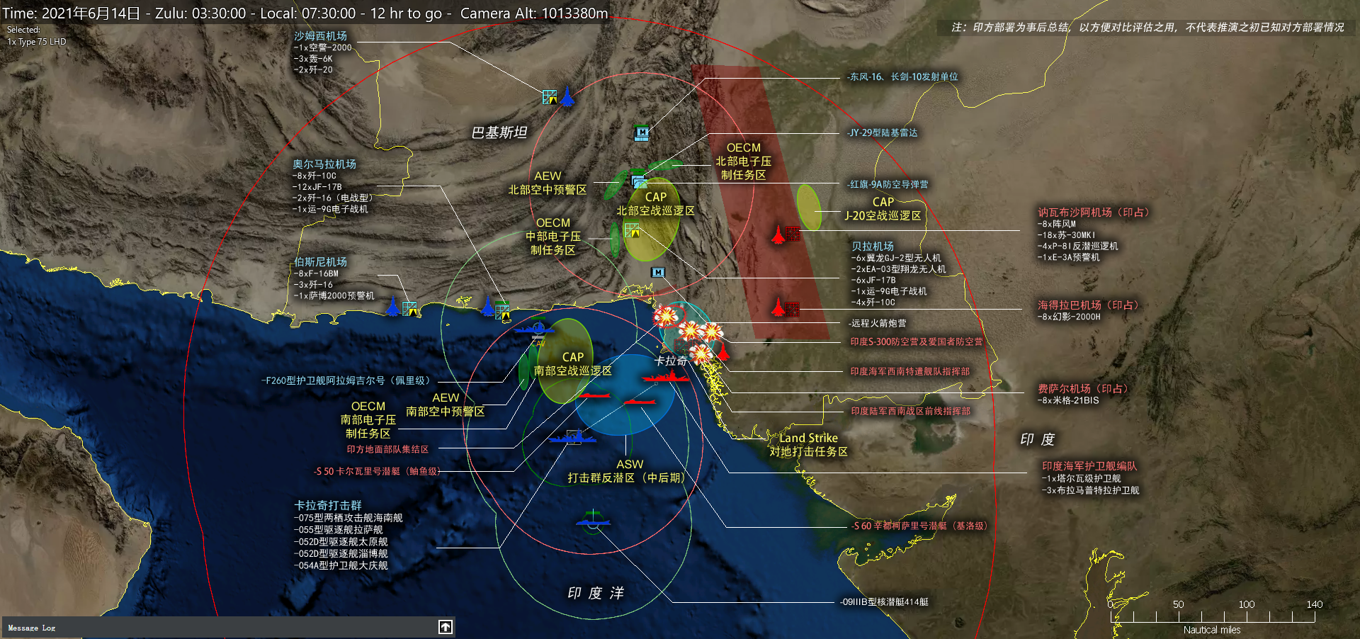 需要注意的是,该想定并非是一个基于当前现状的中印冲突的想定,而是一个不断拓展中的想定系列的第二部。在上一部中,解放军完全取得了安达曼海域的制空权和制海权,重创了印度海军,具体请见如下链接:
