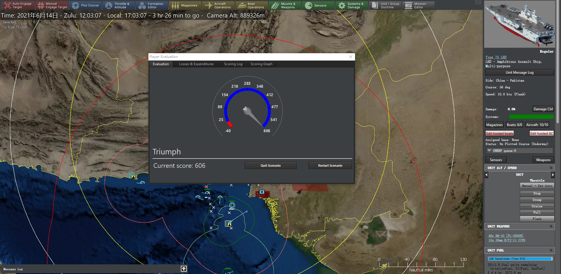 7:53,印方4架苏-30MKI和2架幻影-2000完成整备再次升空,2架歼-16和4架JF-17B(枭龙)迎战,空战中,我方一架JF-17B(枭龙)被击落,但印方4架苏-30MKI和2架幻影-2000被悉数击落。8:07,直-9C再次发现不明水下目标,052D型驱逐舰淄博舰向水下目标发射2枚CY-3型反潜鱼雷,击沉目标,目标确认为印方S 60 辛都柯萨里号潜艇(基洛级)。至此,推演结束,卡拉奇及其周边的全部印方防空阵地、雷达、指挥部等均已肃清,印方海军力量全部得以击沉。