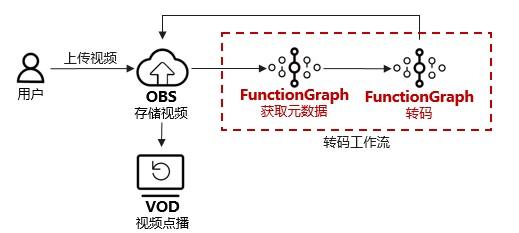 图片压缩、水印处理、文档转换、视频转码是典型的事件触发,波峰波谷明显的场景,越来越多地使用Serverless 函数来开发业务。以视频转码为例,典型的处理流程如下: