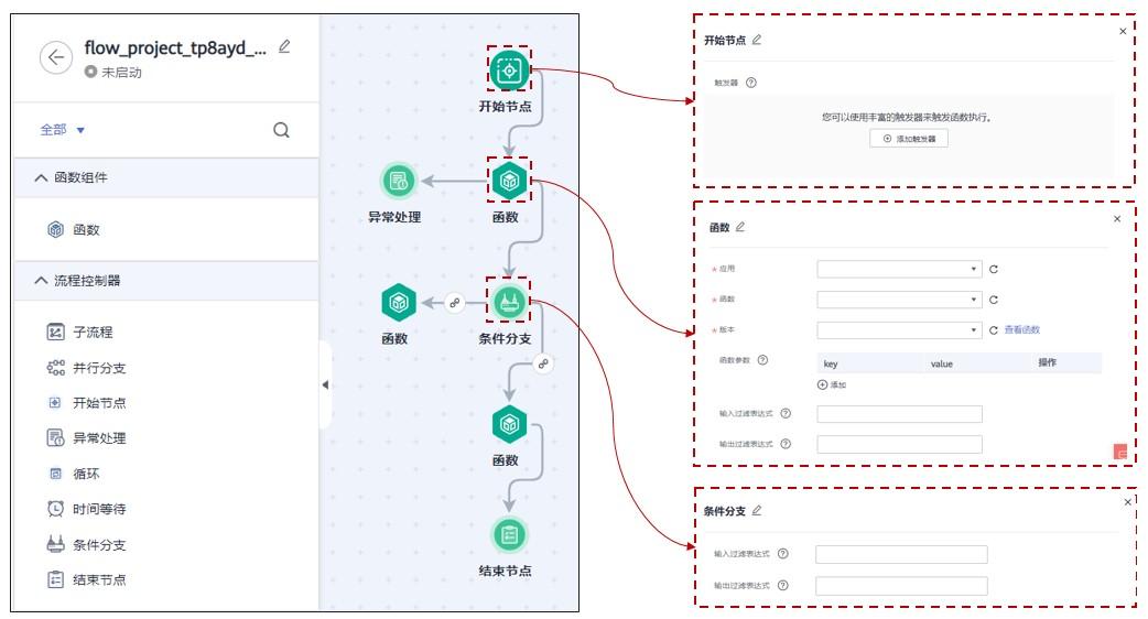 支持通过图形化拖拽方式进行函数编排,支持并行分支、条件分支、子流程、循环、异常处理等,可以满足多函数场景下的快速编排需求。