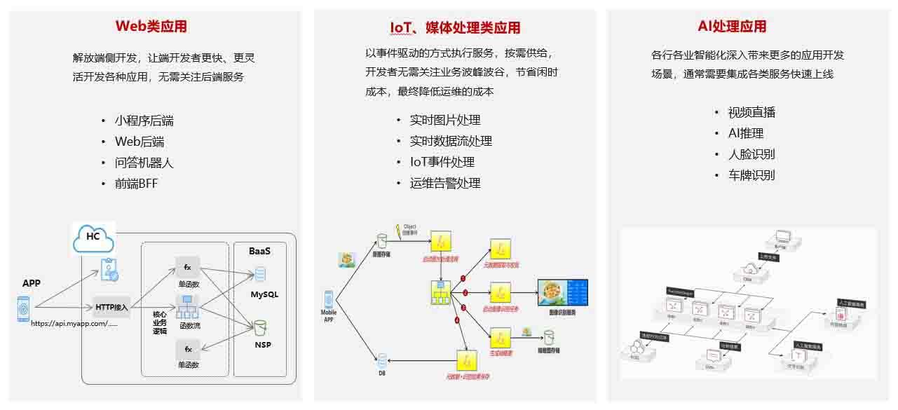 场景一:Web类应用。典型的应用有小程序后端、Web后端、三方服务商对接、前端BFF等。这类应用使用函数编程可以极大简化开发流程,能够做到小时级交付;