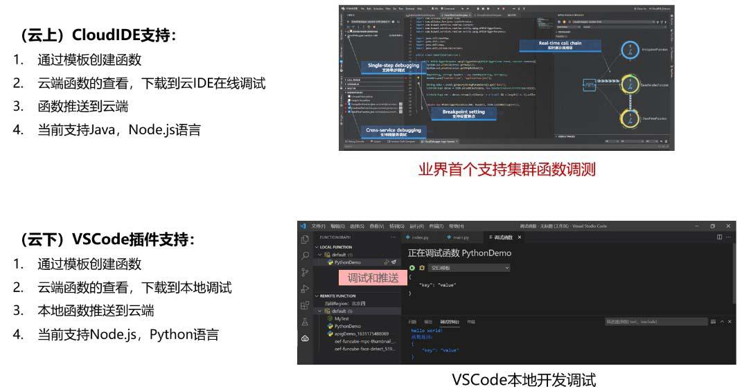 如何对函数进行调试作为Serverless场景的一个难点,华为云针对云上和云下两个场景都提供了解决方案,而且作为业界首家支持多函数调试能力。