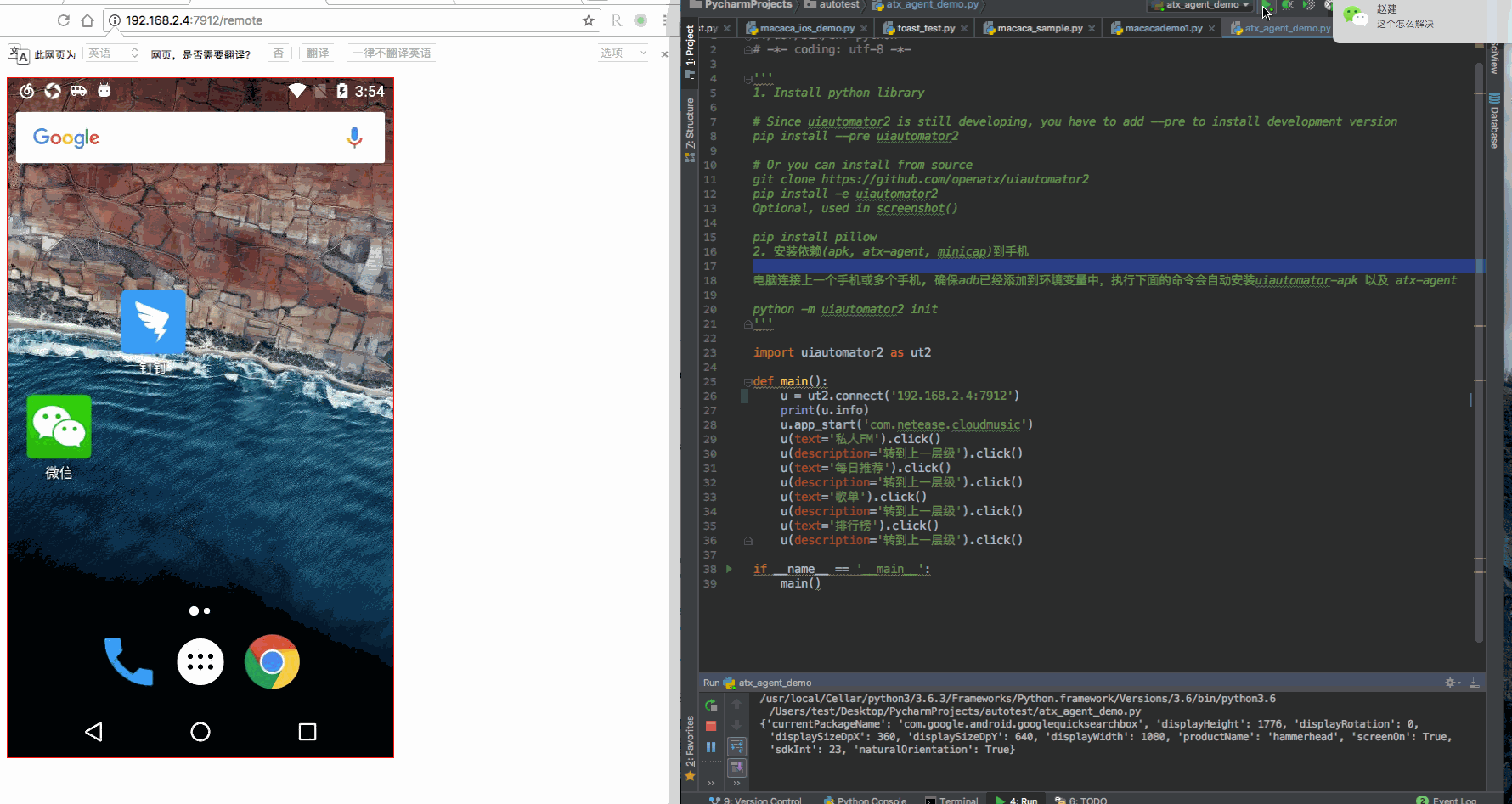 $ python -m uiautomator2 init 172.16.120.20:8000 #将uiautomator安装到手机设备上