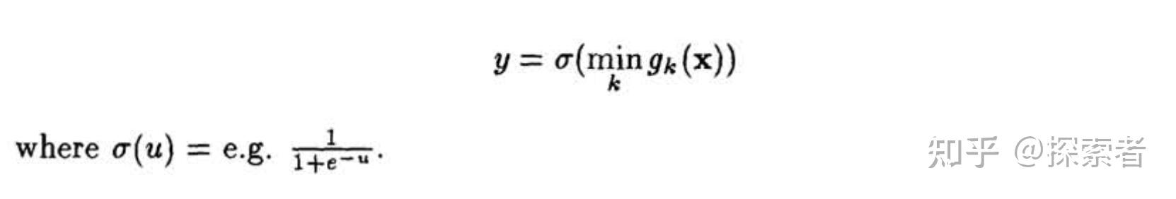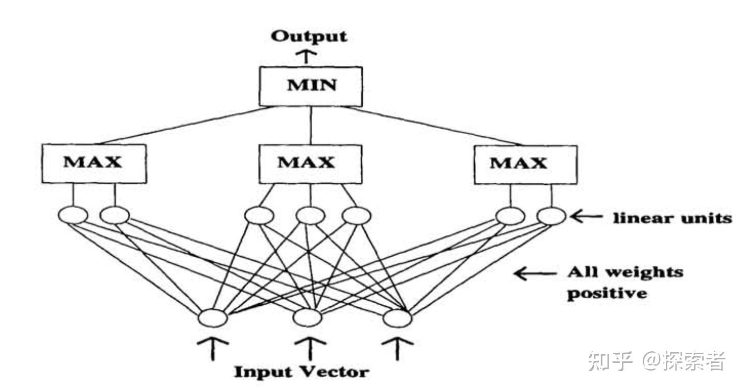该神经网络第一层是我们的输入,第二层将我们输入放到一个全连接层当中,同时,分为3组(我们可以分为k组,看k的取值,怎样达到最好的模型识别准确率,你也可以尝试4,5,6......)。在这三组当中,我们分别找到每一组当中神经元输出最大的神经元,再将这些输出最大的3个神经元进行比较,将这3个神经元当中输出值最小的神经元作为我们的输出,最后通过sigmoid function,得到我们模型最好的输出。下面是该神经网络的数学表达式: