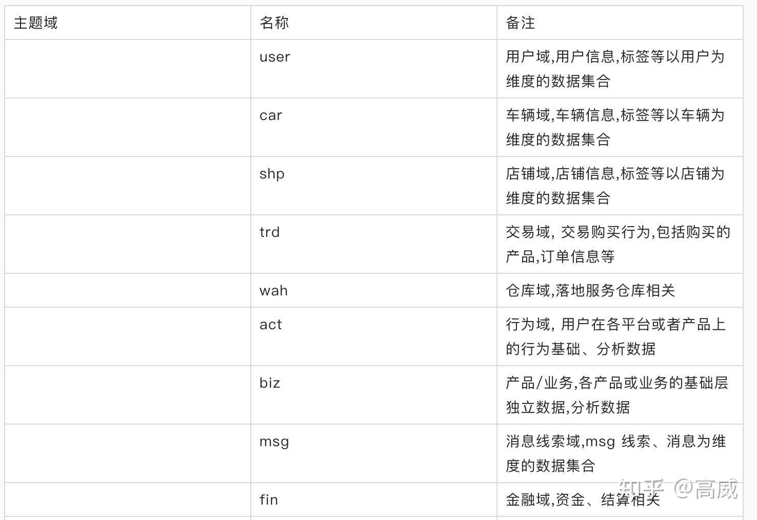 - DWS:事实表 (data warehouse summary) 数据仓库轻度汇总层,按照各个业务域进行轻度汇总成分析某一个主题域的服务数据,一般是宽表。
