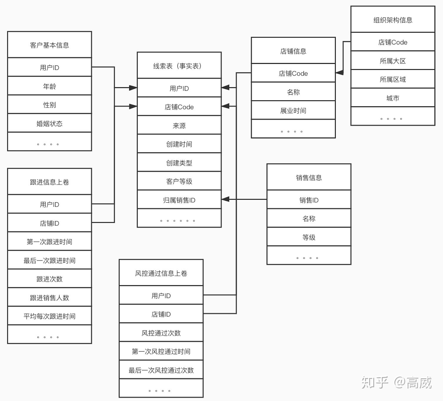 维度表:销售信息表、店铺信息表、跟进表/约见表/风控通过表/订单表的维度上卷。