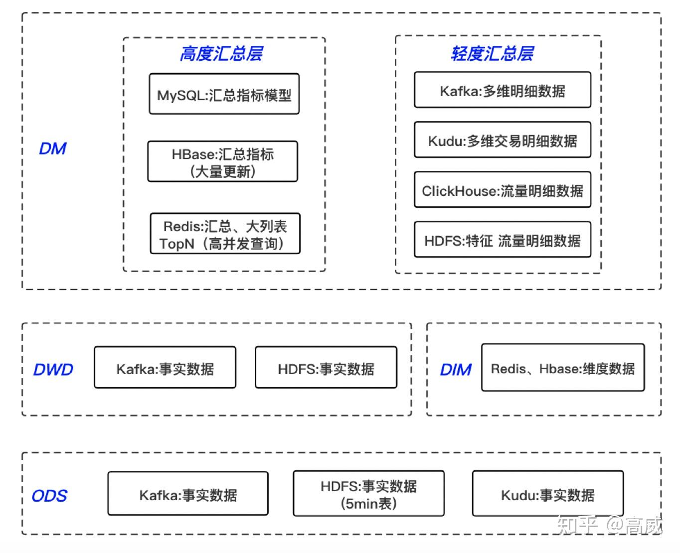 - DIM:维度表,公共维度层,基于维度建模理念思想,建立整个业务过程的一致性维度,主要使用 MySQL、Hbase、Redis 三种存储引擎,对于维表数据比较少的情况可以使用 MySQL,对于单条数据大小比较小,查询 QPS 比较高的情况,可以使用 Redis 存储,降低机器内存资源占用,对于数据量比较大,对维表数据变化不是特别敏感的场景,可以使用HBase 存储。