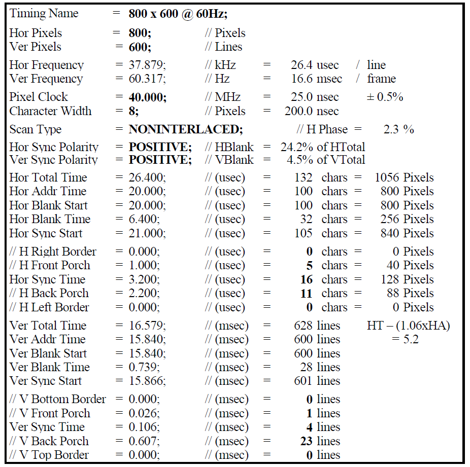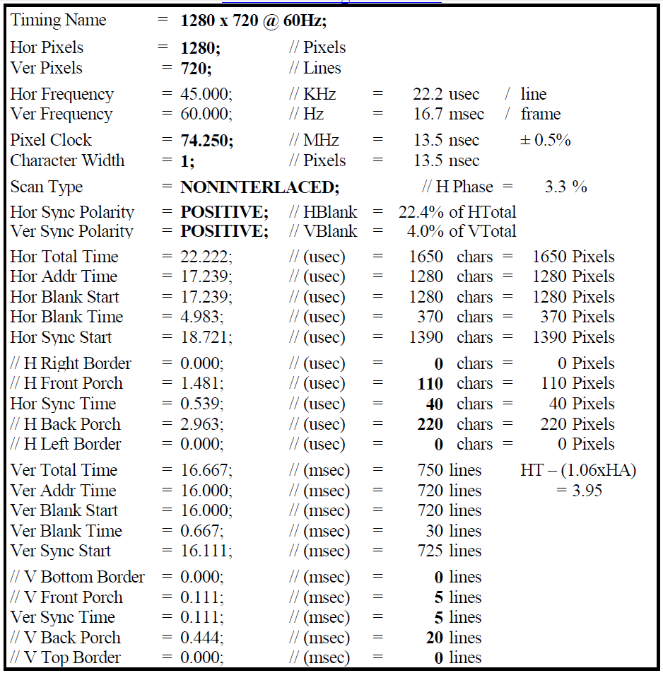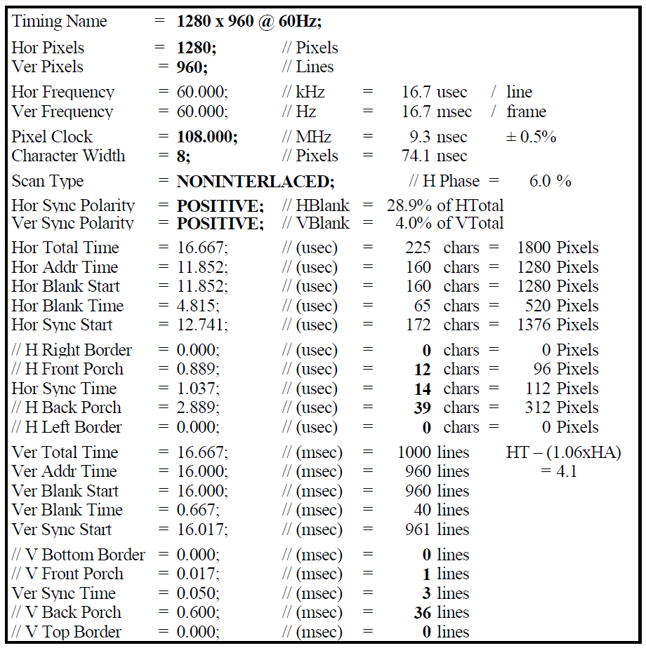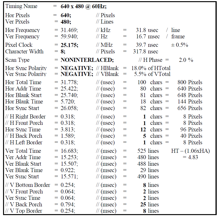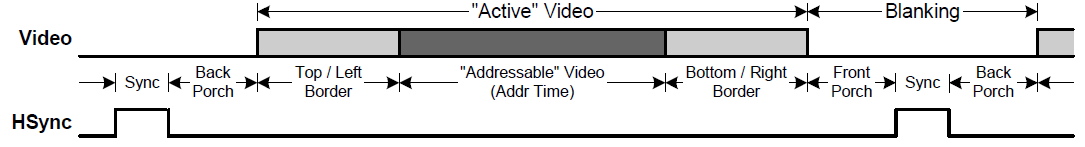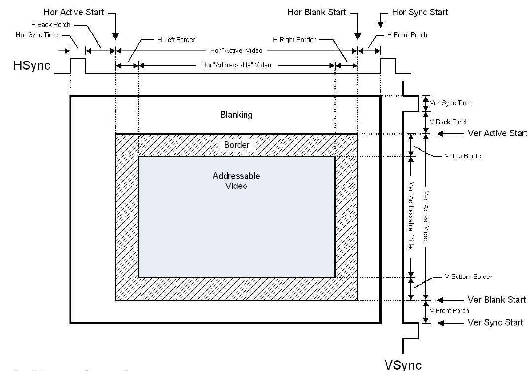 VGA扫描,基本元素是行扫描,多行组成一帧,下图显示一行的时序,其中“Active”Video是一行视频的有效像素,大部分分辨率时钟中Top/Left Border 和 Bottom / Right Border都是0。“Blanking”是一行的同步时间,“Blanking”时间加上Active”Video时间就是一行的时间。“Blanking”又分为“Front Porch”、“Sync”、“Back Porch”三段。