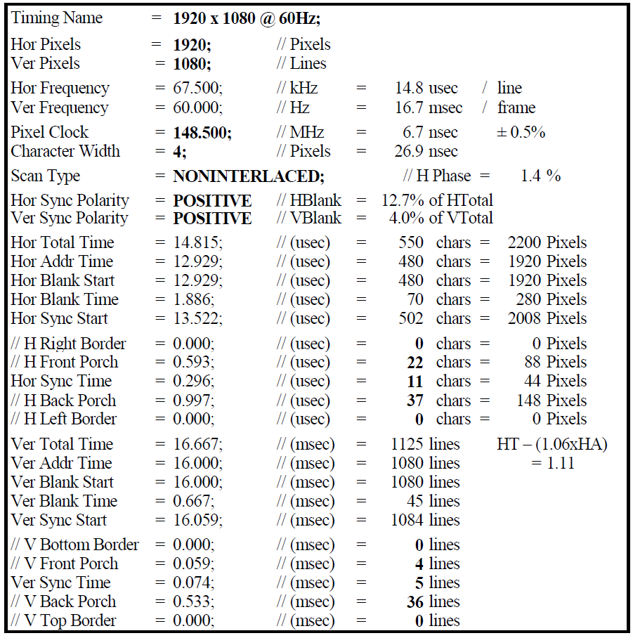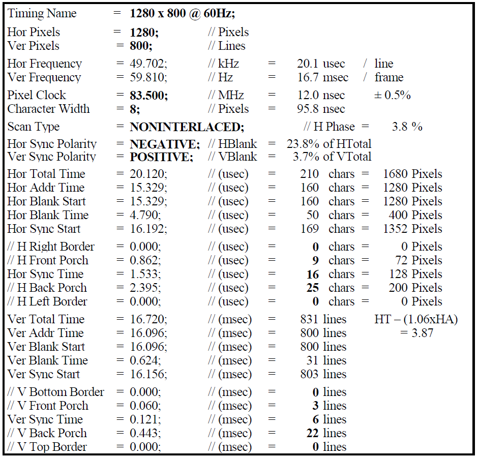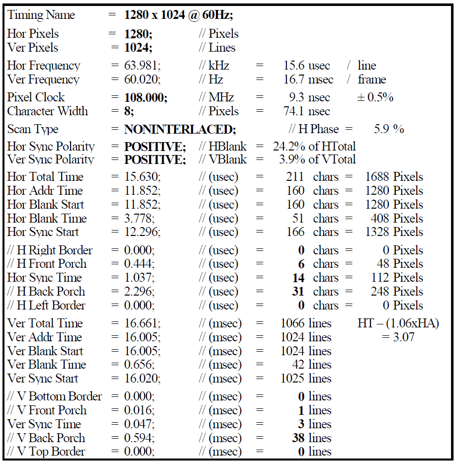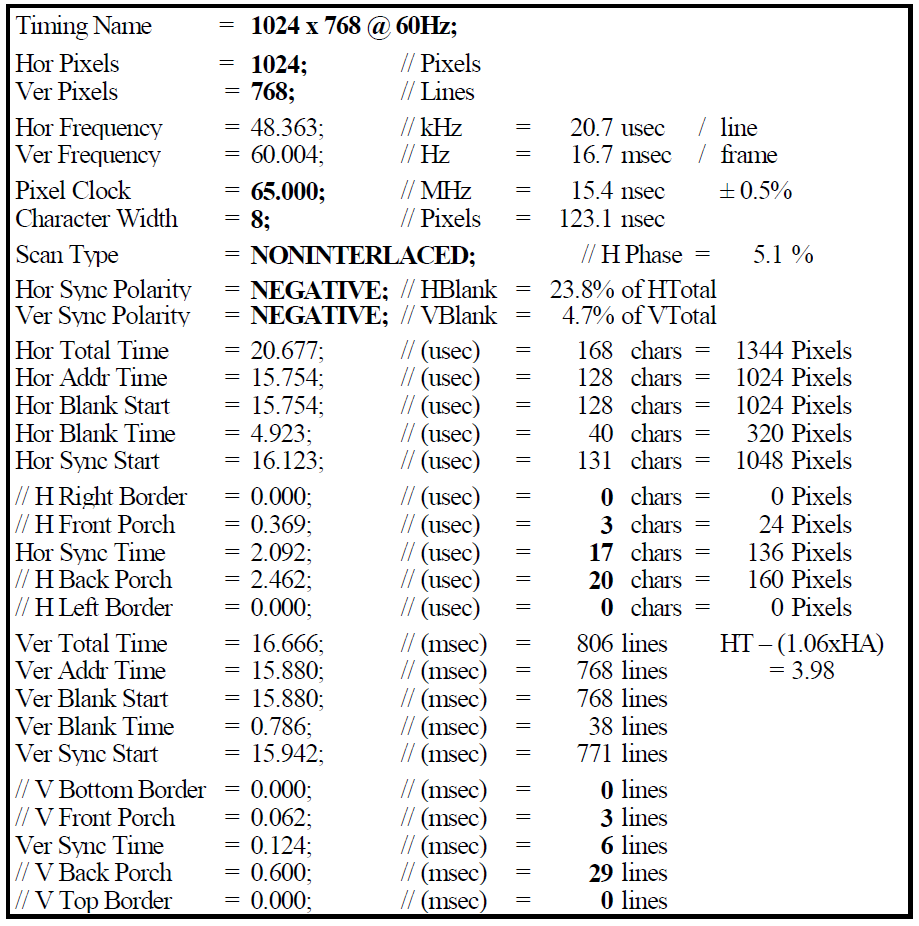 时钟频率:以1024x768@59.94Hz(60Hz)为例,每场对应806个行周期,其中768为显示行。每显示行包括1344点时钟,其中1024点为有效显示区。由此可知:需要点时钟频率:806*1344*60约65MHz。