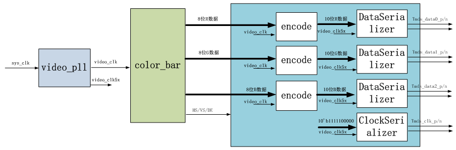 1). encode: 红,绿,蓝的8位视频数据及时钟编码成10位的TMDS视频数据。关于编码的原因和方法我们已经在前面介绍过,具体如何实现,有兴趣的同学可以参考文档"08_其它学习资料\TMDS视频数据编码.doc"