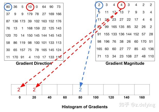 比如上面方向图中蓝圈包围的像素,角度为80度,这个像素对应的幅值为2,所以在直方图80度对应的bin加上2。红圈包围的像素,角度为10度,介于0度和20度之间,其幅值为4,那么这个梯度值就被按比例分给0度和20度对应的bin,也就是各加上2。