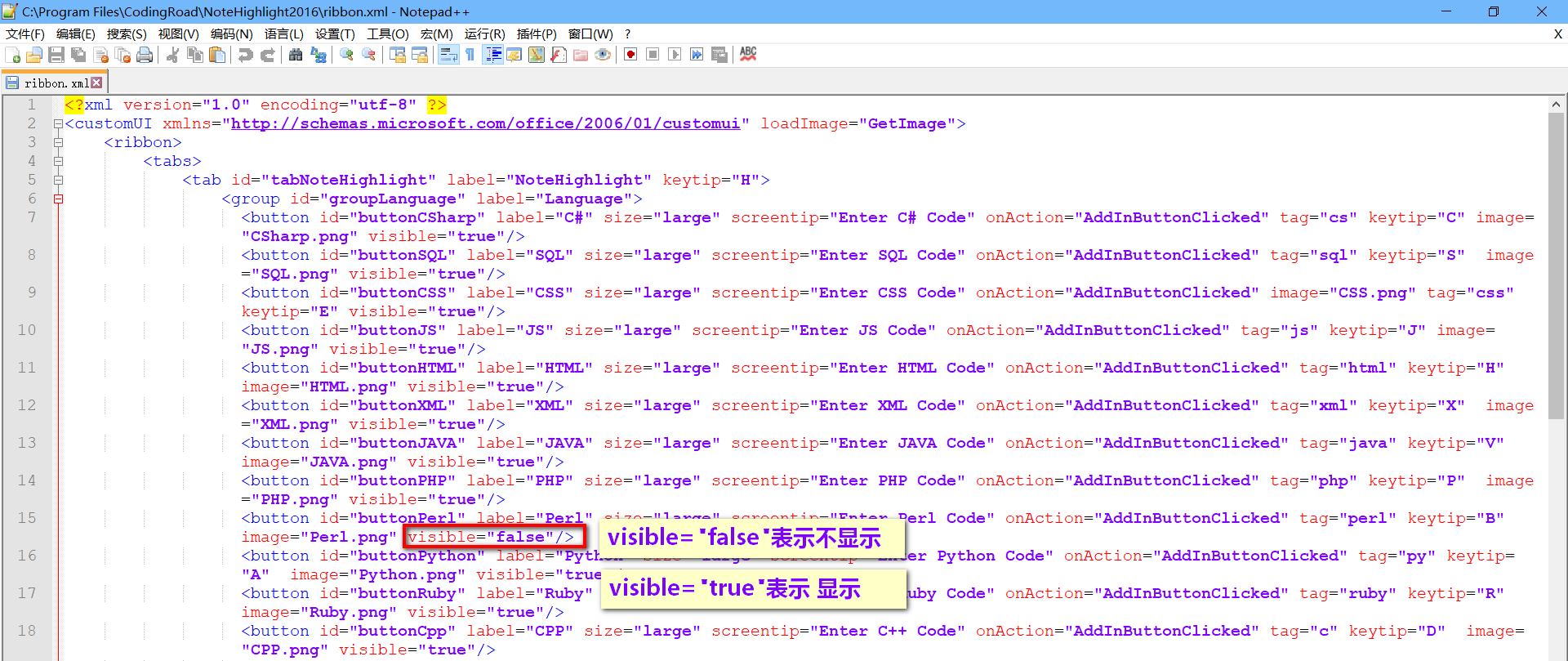 打开安装目录下的C:\Program Files\CodingRoad\NoteHighlight2016\ribbon.xml,将自己需要显示的语言更改为 true,然后重新启动OneNote即可。如图所示。