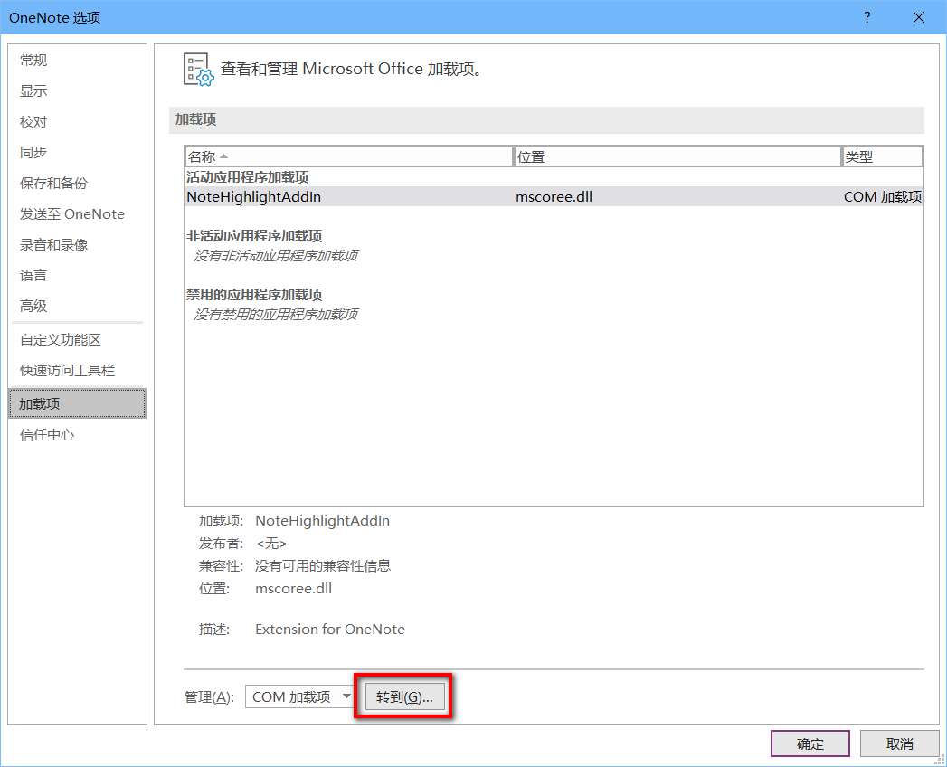 - Solution2:打开onenote,依次点击菜单的"文件""选项""加载项"COM加载项转到勾选,确定。