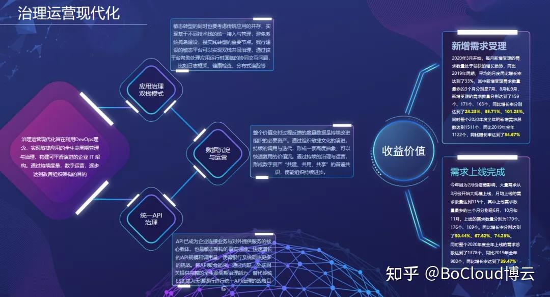 治理运营现代化有三个重点,一是业务治理双站模式,敏态、稳态双态的IT架构;二是我们在研发过程中的数据沉淀和运营,第三是统一 API 治理,包括内部的金融能力,内部的 API 通过内连网关治理,外部通过外连网关治理。数字化建设确实让我们得到了很大收益,比如说需求量,我们统计了一下 2020 年需求量比 2019年 需求量增长了近 40%,我们的自主可控能力也得到大大加强,以前纯自主开发的系统,可能连 10% 都不到,但是我们现在用新的开发平台,新增的这些系统,至少有 30% 以上,都是由我们自主的开发平台纯自主完成的。
