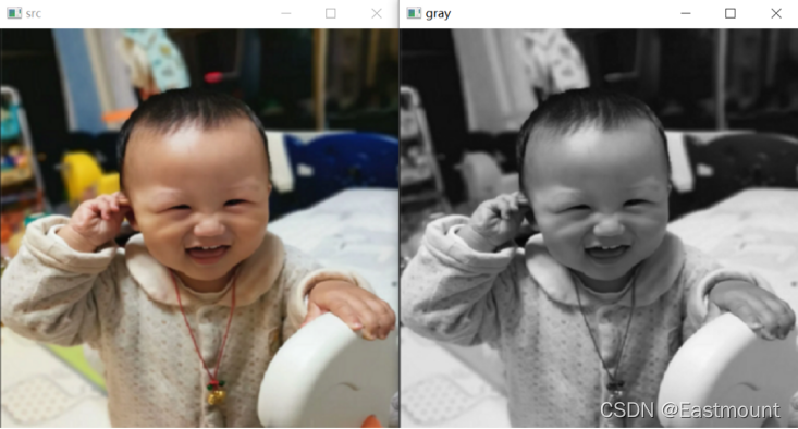 # -*- coding: utf-8 -*- # By:Eastmount import cv2 import numpy as np #读取原始图片 src = cv2.imread(\'luo.png\') #图像灰度化处理 grayImage = cv2.cvtColor(src,cv2.COLOR_BGR2GRAY) #显示图像 cv2.imshow("src", src) cv2.imshow("result", grayImage) #等待显示 cv2.waitKey(0) cv2.destroyAllWindows()