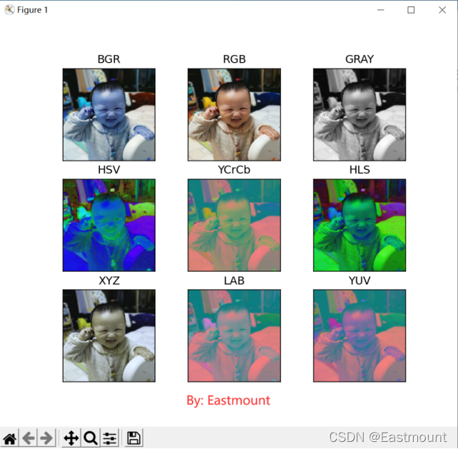 下面代码对比了九种常见的颜色空间,包括BGR、RGB、GRAY、HSV、YCrCb、HLS、XYZ、LAB和YUV,并循环显示处理后的图像。