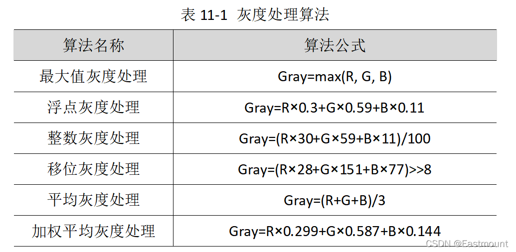 假设某点的颜色由RGB(R,G,B)组成,常见灰度处理算法如表11-1所示: