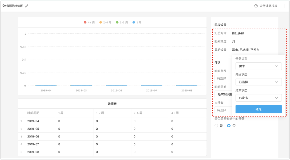 如下图,选择按月统计,任务选择「需求」,开始状态选「已选择」,结束状态选「已发布」,更新左上角的图表名称为「交付周期趋势图」后保存,即可展现。