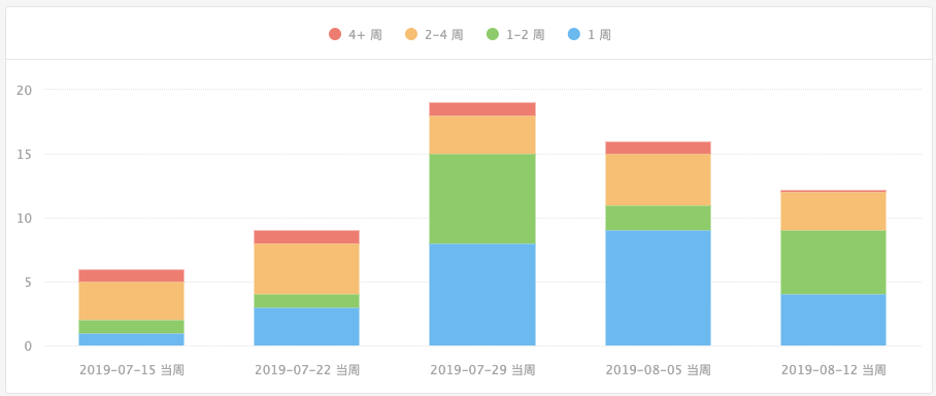 下图是开发周期趋势图示例,横轴是时间,按照自然周排列,纵轴是需求个数。每个柱子代表的是当周已到待发布状态需求的数量,各柱子由不同的颜色堆积而成,蓝色代表需求的开发周期时长小于1周,绿色代表需求的开发周期时长在1-2周之间,橙色代表需求的开发周期时长在2-4周之间,红色代表需求的开发周期时长大于4周。