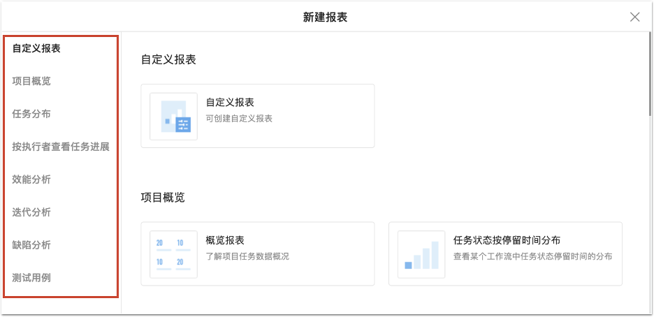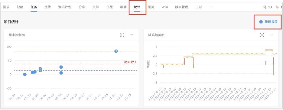 如下图所示,从「统计」进入,点击「新建报表」,可以看到云效的新建报表列表。