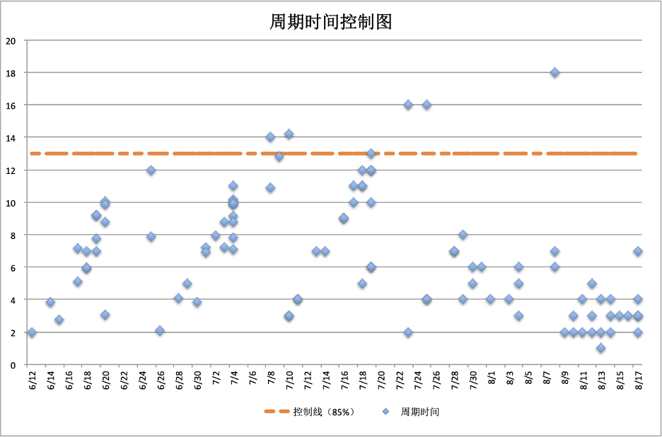 每一个蓝色的点代表一个已经发布的需求,横轴是日期,纵轴是天数。这些蓝色的点越朝下越好,代表需求的交付时间越短,响应力也越好;散点的密度越高代表交付频率越高,散点横向上更均匀分布代表持续交付的稳定性越好。