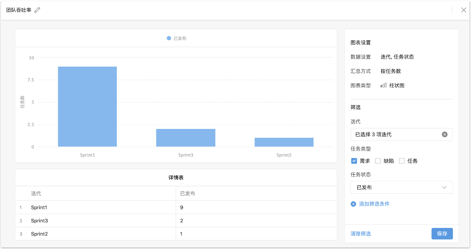 在自定义图表中选择按迭代和任务状态,然后添加两个筛选条件:迭代和状态。迭代选择需要比较的几个迭代,状态只选已发布的需求。出现如下按照迭代进行比较的吞吐率趋势图。
