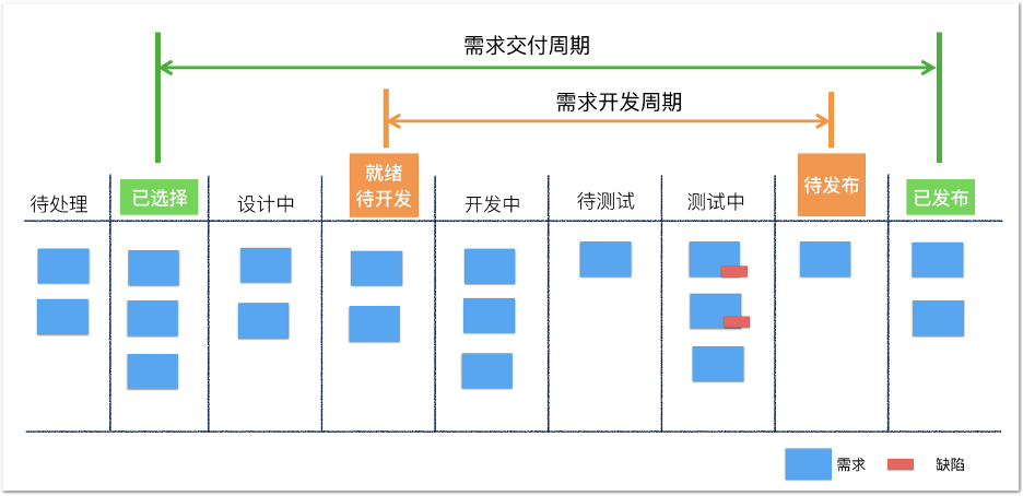 •开发周期:指的是从开发团队理解需求开始,到需求可以上线所经历的平均时长。它反映技术团队的响应能力。