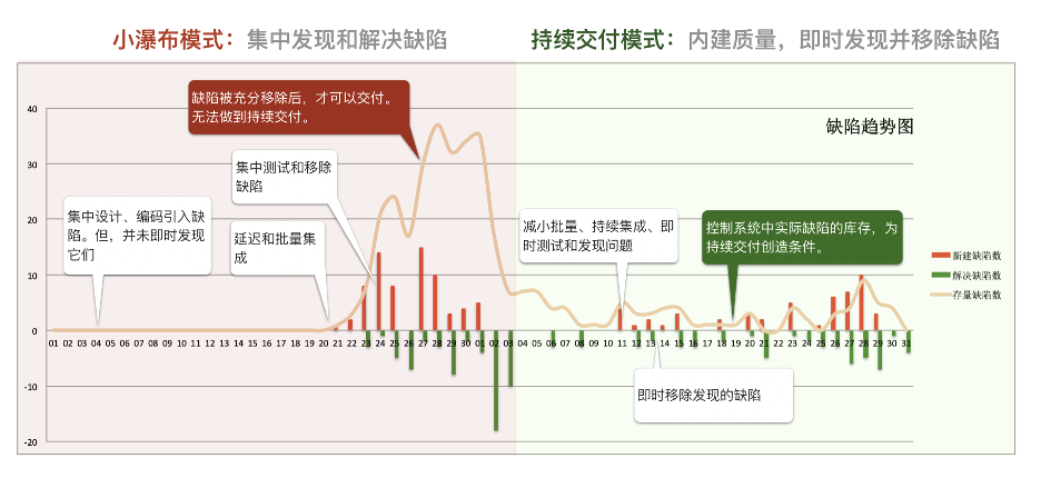 如上图所示,图中的横坐标是日期,横坐标上方红色竖条代表这一天发现缺陷数量;横坐标下方绿色竖条代表当天解决的缺陷数量;橙色曲线代表缺陷存量。图中左右两个部分比较了两种交付模式。